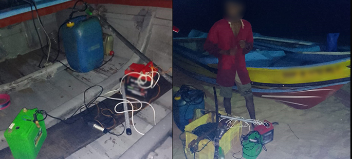විදුලි ආලෝක ධාරා භාවිතයෙන් නීති විරෝධී ධීවර කටයුතු සිදුකළ පුද්ගලයින් 02 ක් උතුරු මුහුදේ දී නාවික හමුදා භාරයට