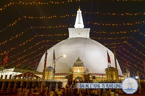 In the evening of 30 October, the Commander of the Navy initiated the ceremonies, after paying his obeisance to Rajakeeya Panditha Ven. Kudagala Ganawimala Thera of Ruwanweliseya. Subsequently, the Kanchuka Puja ceremony took place at the Ruwanweliseya, where the Commander of the Navy flanked by senior officers and members of the Naval Buddhist Association, expressing their spiritual reverence, adorned the pagoda with a Buddhist Flag which was brought to the premises by a colourful procession. The ceremony concluded with the Venerable Maha Sangha performing religious rites to bless the Sri Lanka Navy’s upcoming anniversary as well as Commander of the Navy and naval personnel.