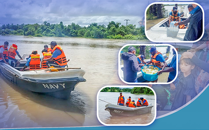 தென் மாகாணத்தின் காலி மாவட்டத்தின் தவலம மற்றும் நாகொட பகுதிகளில் வெள்ளத்தால் பாதிக்கப்பட்ட மக்களுக்கு நிவாரணம் வழங்குவதற்காக நிறுத்தப்பட்டிருந்த கடற்படை அனர்த்த நிவாரணக் குழுக்கள், வெள்ளத்தால் பாதிக்கப்பட்ட மக்களைப் பாதுகாப்பாக மீட்பதற்கும் அவர்களின் அன்றாடத் தேவைகளைப் பூர்த்தி செய்வதற்கும் சிறிய படகுகளைப் பயன்படுத்தி தங்கள் அனர்த்த நிவாரணப் பணிகளைத் தொடர்ந்து மேற்கொண்டு வருகின்றன.
