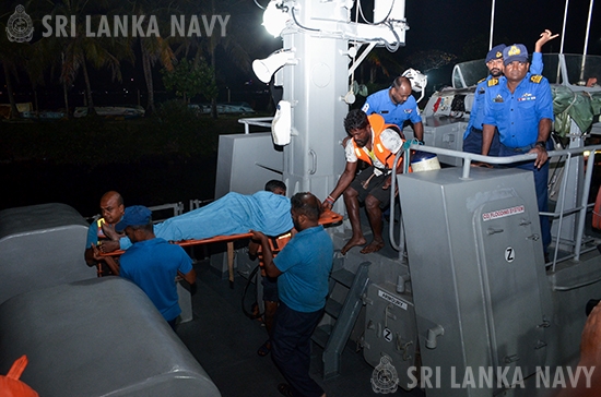 இலங்கையின் தெற்கு கடற்கரையின் ஆழ்கடலில் கடுமையாக நோய்வாய்ப்பட்ட உள்ளூர் பல நாள் மீன்பிடி படகில் இருந்த ஒரு மீனவர், கொழும்பில் உள்ள கடல்சார் தேடல் மற்றும் மீட்பு ஒருங்கிணைப்பு மையத்தின் ஒருங்கிணைப்பின் கீழ் கடற்படைக் கப்பலால் அவசரமாக கரைக்கு கொண்டு வரப்பட்டு, இன்று (2026 ஜனவரி 19,) காலை கடற்படையினரால் சிகிச்சைக்காக காலியில் உள்ள கராப்பிட்டிய போதனா மருத்துவமனைக்கு அனுப்பி வைக்கப்பட்டார்.
