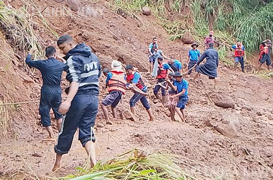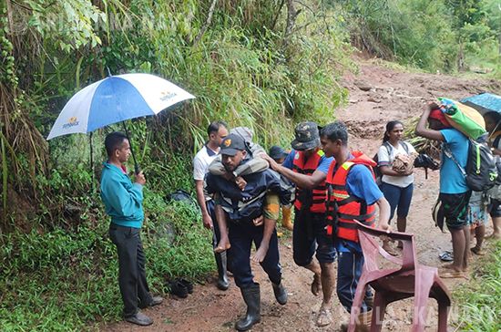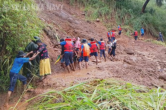 The collapse of an earth mound had blocked the only road to the Unuwinna village in Maoya, stranding seventeen (17) families. The Navy relief teams, assisted by local residents, safely guided all individuals, including eighteen (18) children, to secure locations.