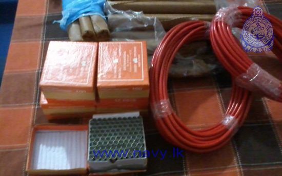 Naval Personnel attached to SLNS Thambapanni of the North Western Naval Command on information received recovered 10 kilograms of Gelignite (100 Sticks), 500 numbers non electric detonators and 15 feet two safety fuse rolls with one person in the general area of Anuradhapura on 13th June 2014. The arrested person with the explosives were handed over to Anuradhapura Police for further investigations.