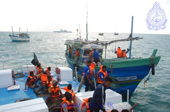 Sri Lanka Navy facilitated the repatriation of 41 Sri Lanka fishermen who had been released from the Indian custody. The fishermen along with 8 fishing trawlers were taken over from Indian Coast Guard Ship “Sarang” at the Indo-Sri Lanka International Maritime Boundary Line (IMBL) North of Kankasanturai on 24th July 2014. Sri Lanka Naval Ship ‘Ranarisi’ and Sri Lanka Coast Guard Ship CG 47 assisted the humanitarian mission.